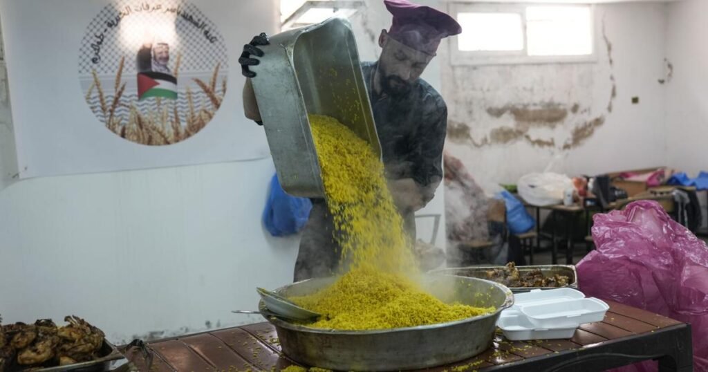 TULKAREM, West Bank (AP) — At a makeshift kitchen inside a city office building, volunteers rub paprika, oil and salt on slabs of chicken before arraying them on trays and slipping them into an oven. Once the meat is done, it is divided into portions and tucked into plastic foam containers along with piles of yellow rice scooped from large steel pots.
