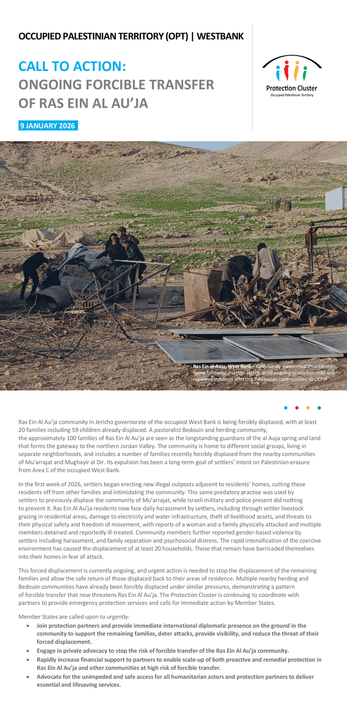 This forced displacement is currently ongoing, and urgent action is needed to stop the displacement of the remaining families and allow the safe return of those displaced back to their areas of residence. Multiple nearby herding and Bedouin communities have already been forcibly displaced under similar pressures, demonstrating a pattern of forcible transfer that now threatens Ras Ein Al Au’ja. The Protection Cluster is continuing to coordinate with partners to provide emergency protection services and calls for immediate action by Member States.