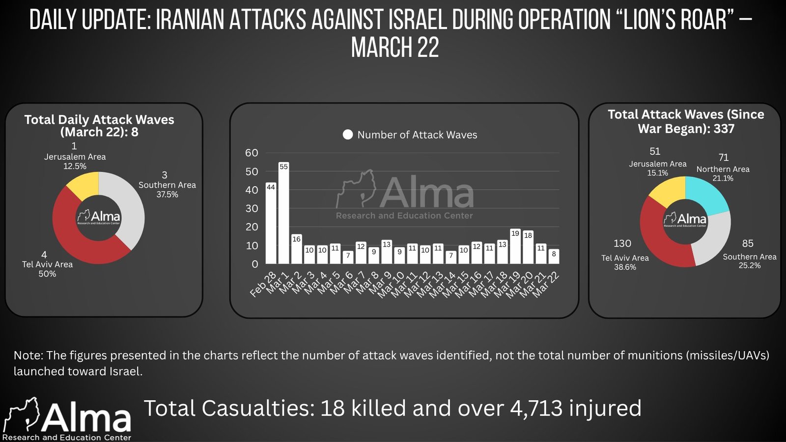 On March 22, 8 Iranian attack waves against Israel were identified, carried out using ballistic missiles. This represents a decrease in the scope of attacks compared to previous days, while still maintaining ongoing activity within the broader pattern of sustained attacks. Geographically, the attacks were distributed across several regions: 4 attack waves (50%) targeted the Tel Aviv area, 3 waves (37.5%) targeted southern Israel, and 1 wave (12.5%) targeted the Jerusalem area. As on previous days, there remains a focus on central Israel, alongside complementary targeting of the south. Cluster warhead missiles were launched toward the Tel Aviv area. These warheads disperse into multiple submunitions mid-air, striking several locations simultaneously. The use of such weapons significantly expands the impact area and increases the risk to civilians, particularly in densely populated urban environments. As a result of the attacks, civilian areas were hit in the cities of Tel Aviv, Ramat Gan, Petah Tikva, and Holon. In addition, in recent days, a kindergarten in the city of Rishon LeZion was struck, highlighting the direct impact on civilian spaces and daily life. Since the beginning of the campaign, a total of 337 Iranian attack waves against Israel have been identified. In cumulative geographic distribution, the central region—particularly the Tel Aviv metropolitan area—continues to be the primary target. Impact on the Israeli civilian sphere: Since the start of the war, 18 civilians have been killed, and over 4,713 individuals have been injured to varying degrees due to direct impacts, falling interception debris, and secondary damage. Additionally, approximately 5,000 Israelis have been displaced from their homes due to missile strikes. Most impacts have been recorded in Tel Aviv, Beit Shemesh, Dimona, Arad, and Be’er Sheva, alongside additional locations across the country. Trend analysis indicates that despite daily fluctuations, a relatively stable pace of attacks is being maintained, reflecting a strategy of sustained pressure on the Israeli home front, with a focus on central Israel and the use of weapons designed to maximize the scope of impact.