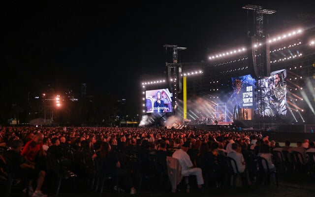 Pop star Eden Hason later took the stage to perform Hanan Ben Ari’s “What Do You Want From Me” — a ballad questioning God’s purpose in human suffering — as the names of the October 7 victims illuminated the screen behind him.