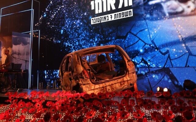 The stage at Israel’s national October 7 memorial ceremony in Tel Aviv’s Yarkon Park, with a burned car destroyed by Hamas terrorists along the Gaza border, October 7, 2025. (Alon Levin/Pro-Democracy Protest Movement)