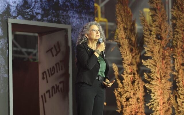 Mazi Eilon, widow of Tal Eilon, Kibbutz Kfar Aza’s security coordinator who was killed defending his community, shared her story as a recording of her husband’s final radio calls played to the audience — his voice urging his team to fight back against the infiltrating terrorists.