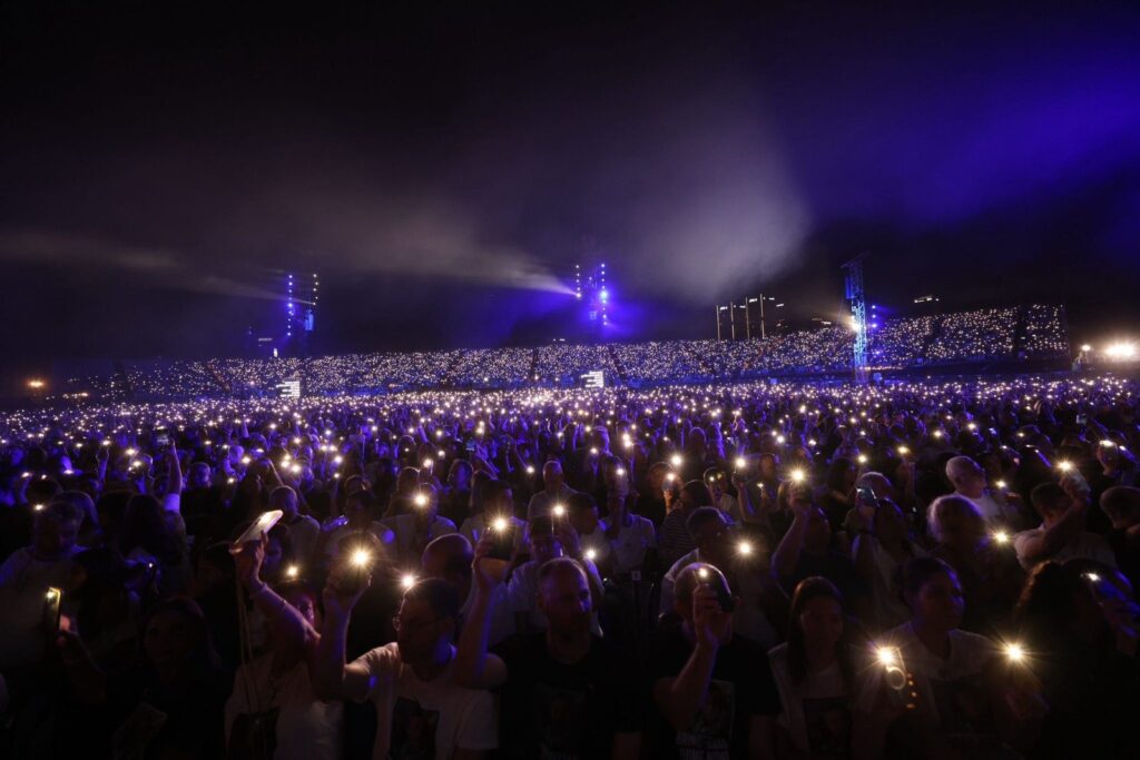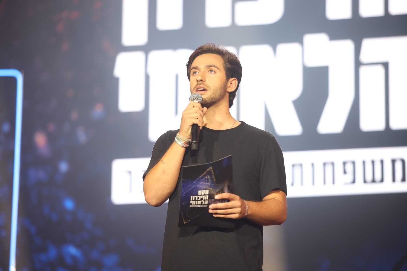 Throughout the night, pre-recorded testimonies from survivors and bereaved families played on large screens. In one, several fathers who lost their children on October 7 read aloud the lyrics to singer Mooki’s “Daddy’s Boy” — lines like “Father is always here to hug and protect you” and “My child, go only on your own path” — drawing tears from the crowd.