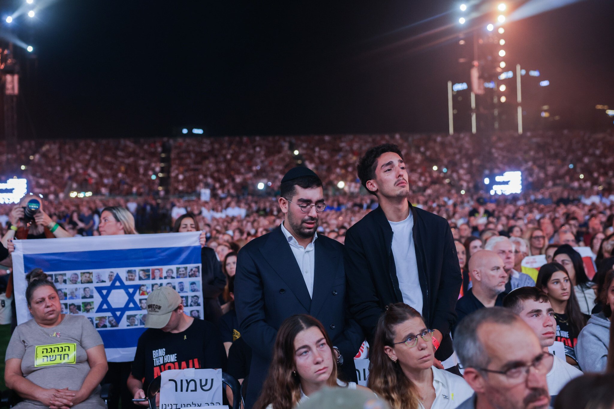 As the evening unfolded, calls for the release of the remaining 48 hostages — including 47 abducted on October 7 and the body of a soldier killed in 2014 — reverberated throughout the park.