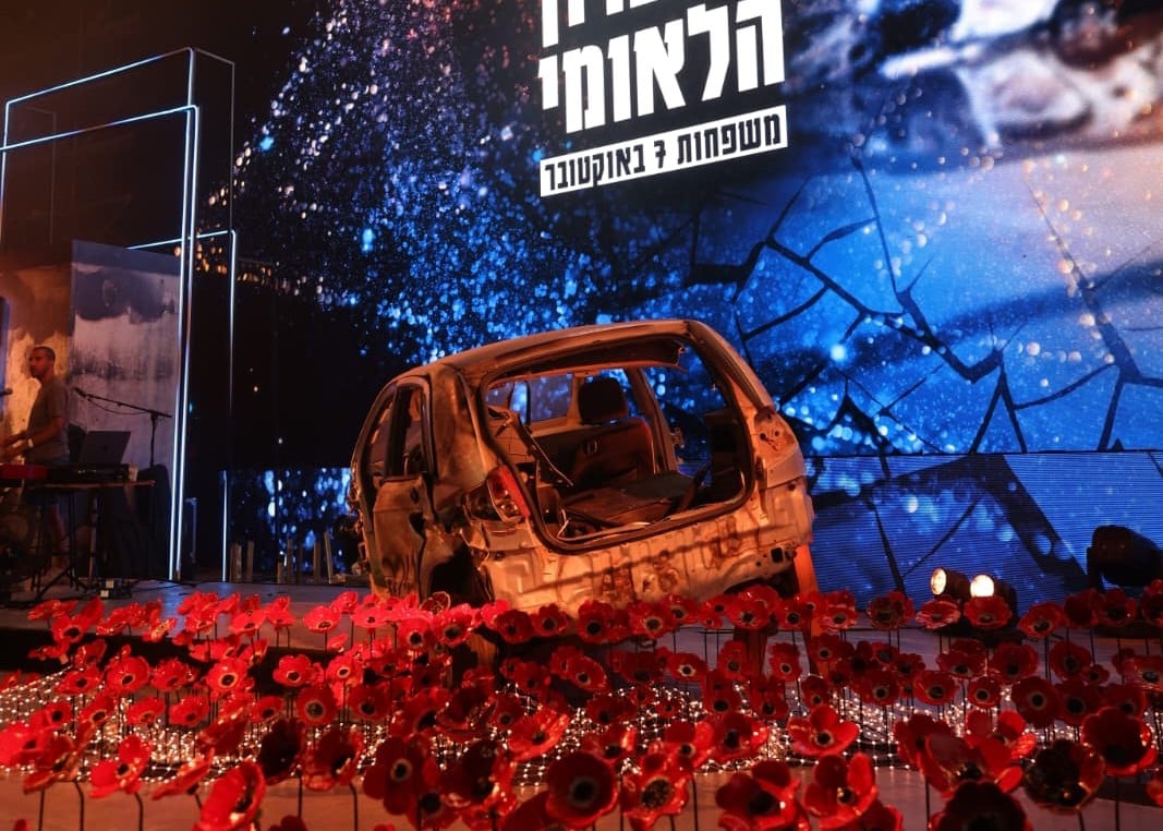 The stage at Israel’s national October 7 memorial ceremony in Tel Aviv’s Yarkon Park, with a burned car destroyed by Hamas terrorists along the Gaza border, October 7, 2025. (Alon Levin/Pro-Democracy Protest Movement)