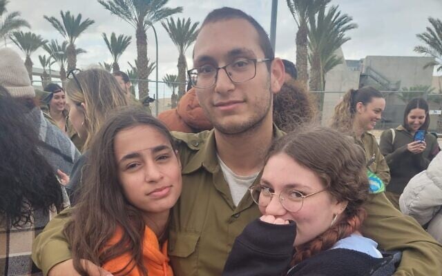 Tamir Nimrodi, center, taken hostage from his army base on October 7, 2023, with his two younger sisters, Mika, left and Amit (Courtesy)
