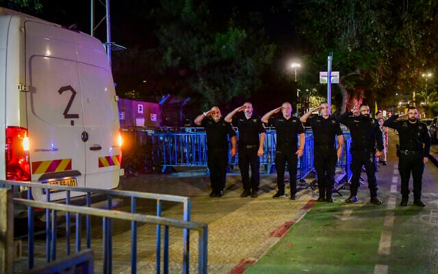 Security forces pay their respects as the convoy carrying four bodies, three of them hostages, arrives at the Abu Kabir Forensic Institute in Tel Aviv, on October 15, 2025. (Avshalom Sassoni/Flash90)