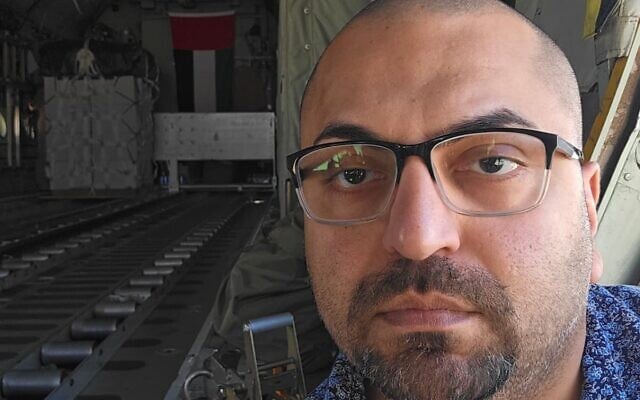 Ahmed Fouad Alkhatib aboard an aircraft preparing to airdrop aid into Gaza, August 25, 2025 (courtesy).