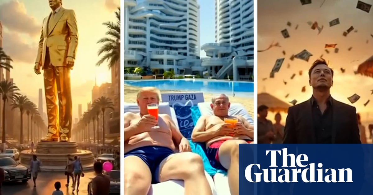 The video – posted by Trump on his Truth Social account last week – depicts a family emerging from the wreckage of war-torn Gaza into a beachside resort town lined with skyscrapers. Trump is seen sipping cocktails with a topless Benjamin Netanyahu on sun loungers, while Elon Musk tears flatbread into dips.